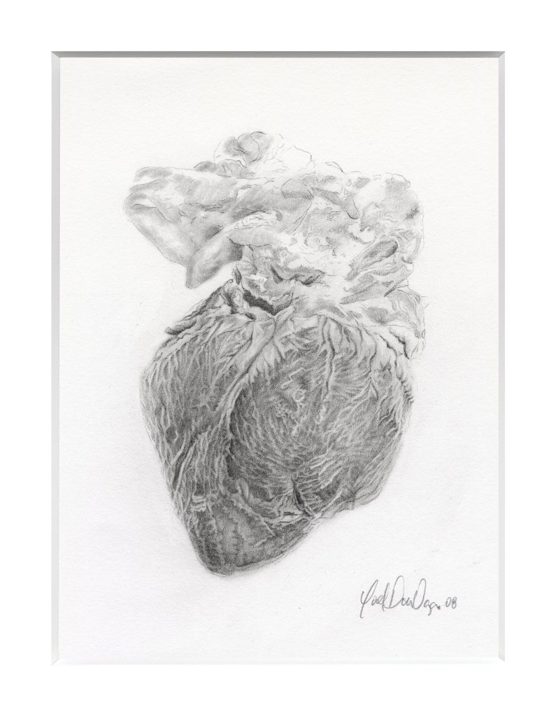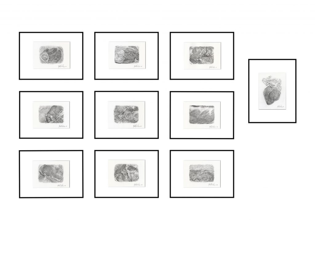 The installation brings together nine drawings of anonymous fragments of flesh and a tenth depicting a pig’s heart—an organ close to the human in both anatomy and cultural resonance. Its presence suggests absent beats and amplifies the tension between the vital and the inert, between persistence and decay.